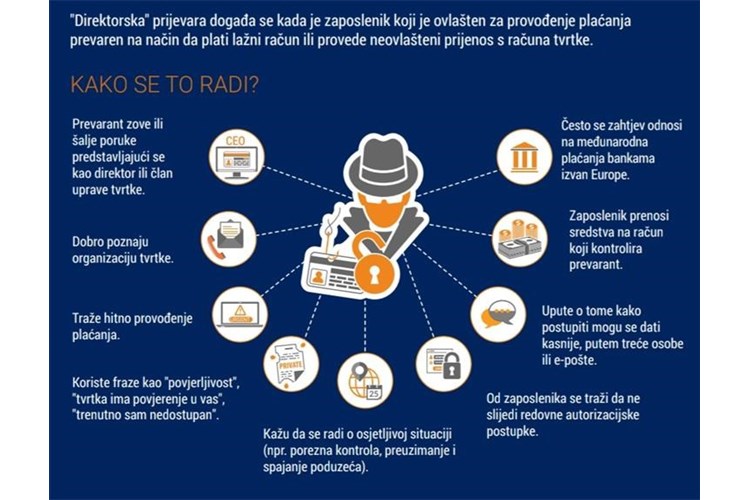 CEO prijevari / direktorskoj prijevari, kod koje se varalice pretvaraju kao nadređeni u organizaciji i prijevarom navode djelatnike da uplatite novčani iznos na lažni račun ili da neovlašteno doznače novce s poslovnog računa.