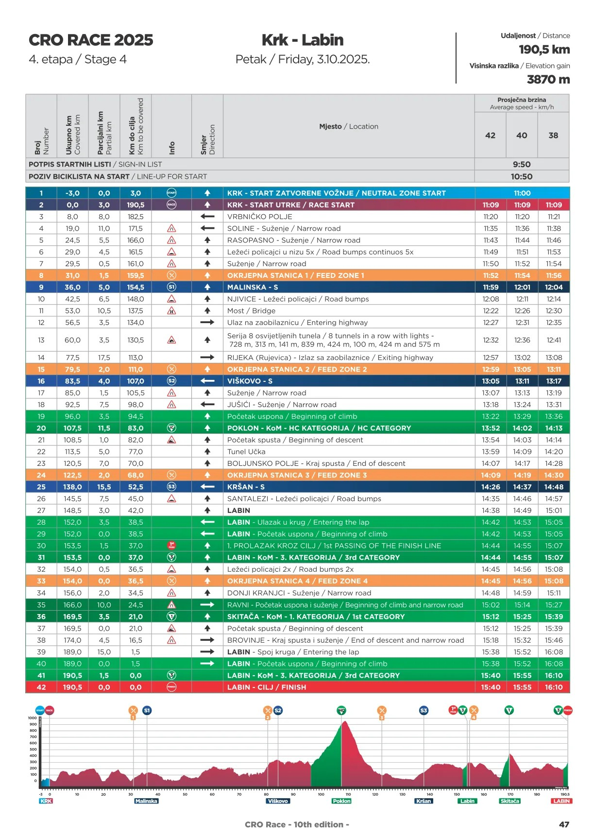- cesta D500 na potezu Tunel Učka - Šušnjevica - Kršan/D64 - Vozilići (kružni tok) zatvara se u 13.10 sati, dok se sve ostale ceste na dionici Kršan - Santalezi - Labin zatvaraju ovisno o razvoju biciklističke utrke tj. prosječnoj brzini biciklista,