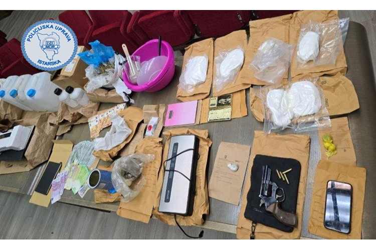 Temeljem naloga nadležnog suda, policijski službenici su 10. prosinca obavili pretrage stanova i vozila osumnjičenih na području Medulina te su pritom pronašli više pakiranja s ukupno 3.250,2 grama amfetamina, 3.645,5 grama marihuane te novac u vrijednosti više tisuća eura za koji se sumnja da potječe od prodaje droge. Policijski službenici pronašli su i mobitele, revolver marke Magnum cal. 357, više vrsta tekućih materija karakterističnih za proizvodnju amfetamina, rukavice, masku s filterima, digitalne vage, uređaje za vakumiranje i drugi pribor za proizvodnju i pakiranje droge, a pronađena je i bilježnica s evidencijom dugovanja.