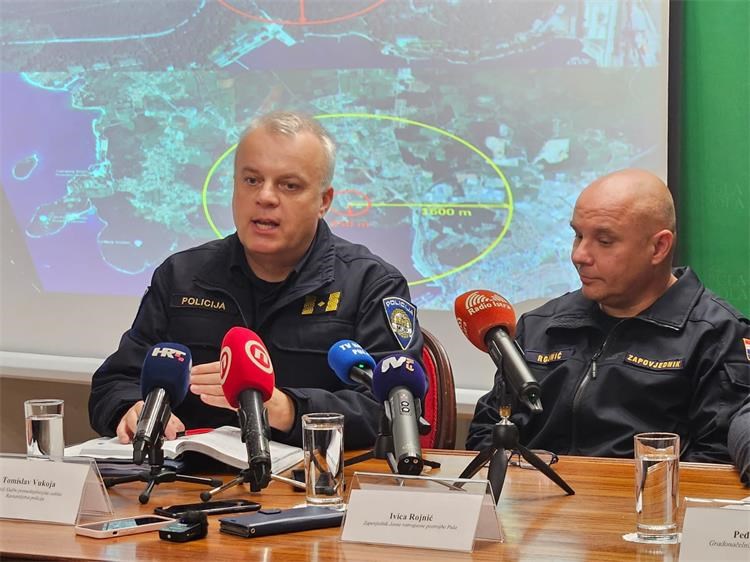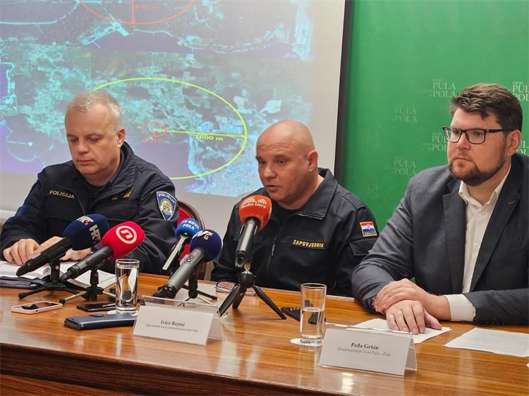 Foto: PU istarskaU Komunalnoj palači u Puli danas je održana konferencija za medije povodom predstojeće provedbe aktivnosti onesposobljavanja, premještanja i uništenja zrakoplovne bombe koja je pronađena 15. listopada tijekom izvođenja građevinskih radova na Velom Vrhu. Na konferenciji za medije sudjelovali su načelnik Stožera civilne zaštite Grada Pule Ivica Rojnić, pulski gradonačelnik Peđa Grbin te predstavnici Ministarstva unutarnjih poslova - voditelj Protueksplozijske službe Ravnateljstva policije Tomislav Vukoja i voditelj Službe civilne zaštite Pazin Mladen Kiković.
